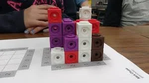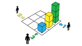 Below is an overhead shot of a completed 4 by 4 city block. To help illustrate the different sizes, I’ve coloured each size of skyscraper a different colour. Notice that each row has exactly 1 of each size, and that each column has one of each size as well.